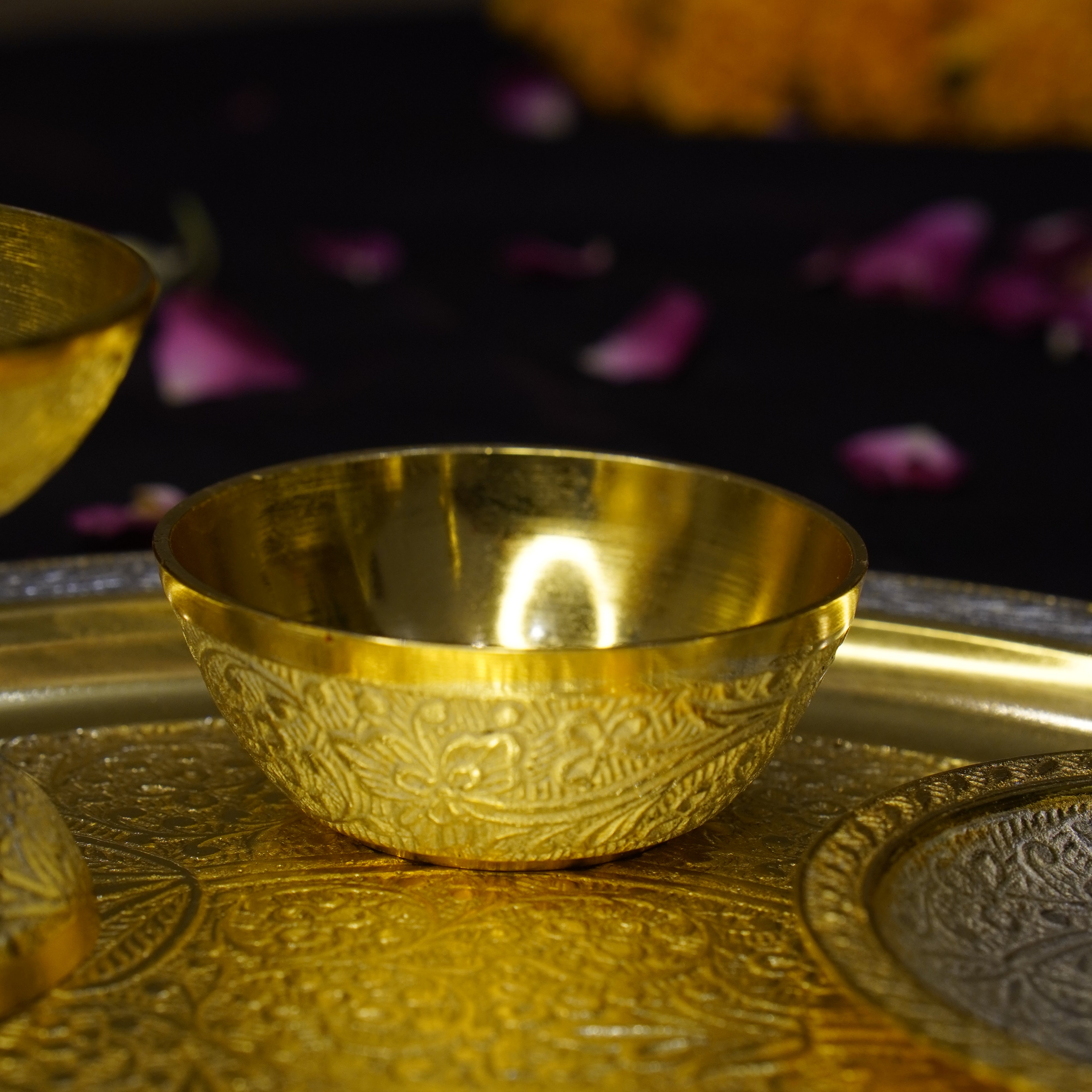 Intricate Hand-Etching: Each item in the set—Aarti Thali, Bell, Agarbatti Stand, Spoon and Bowl, Diya, and Lutiya—is adorned with delicate hand-etched floral motifs, reflecting traditional Indian artistry.